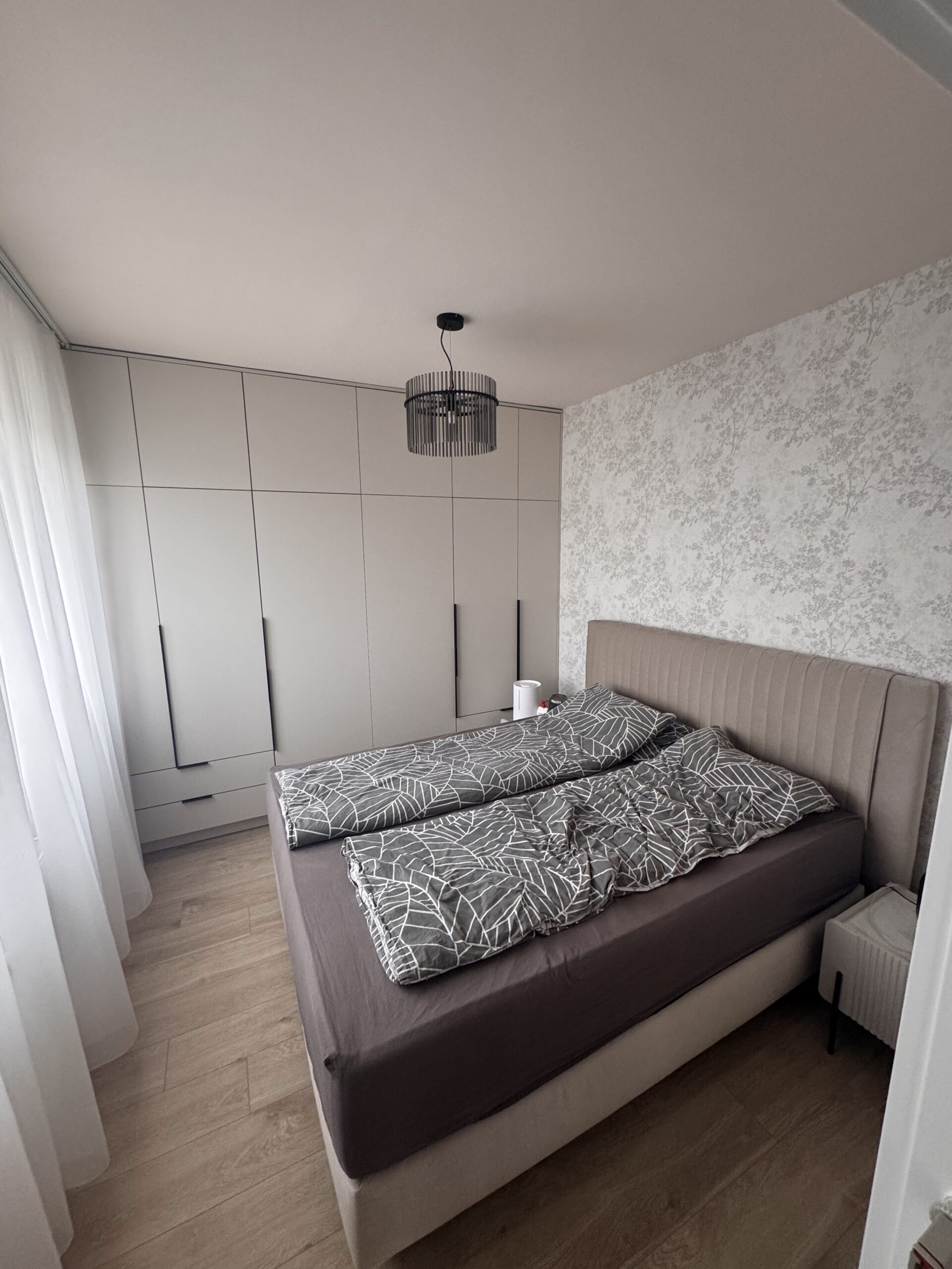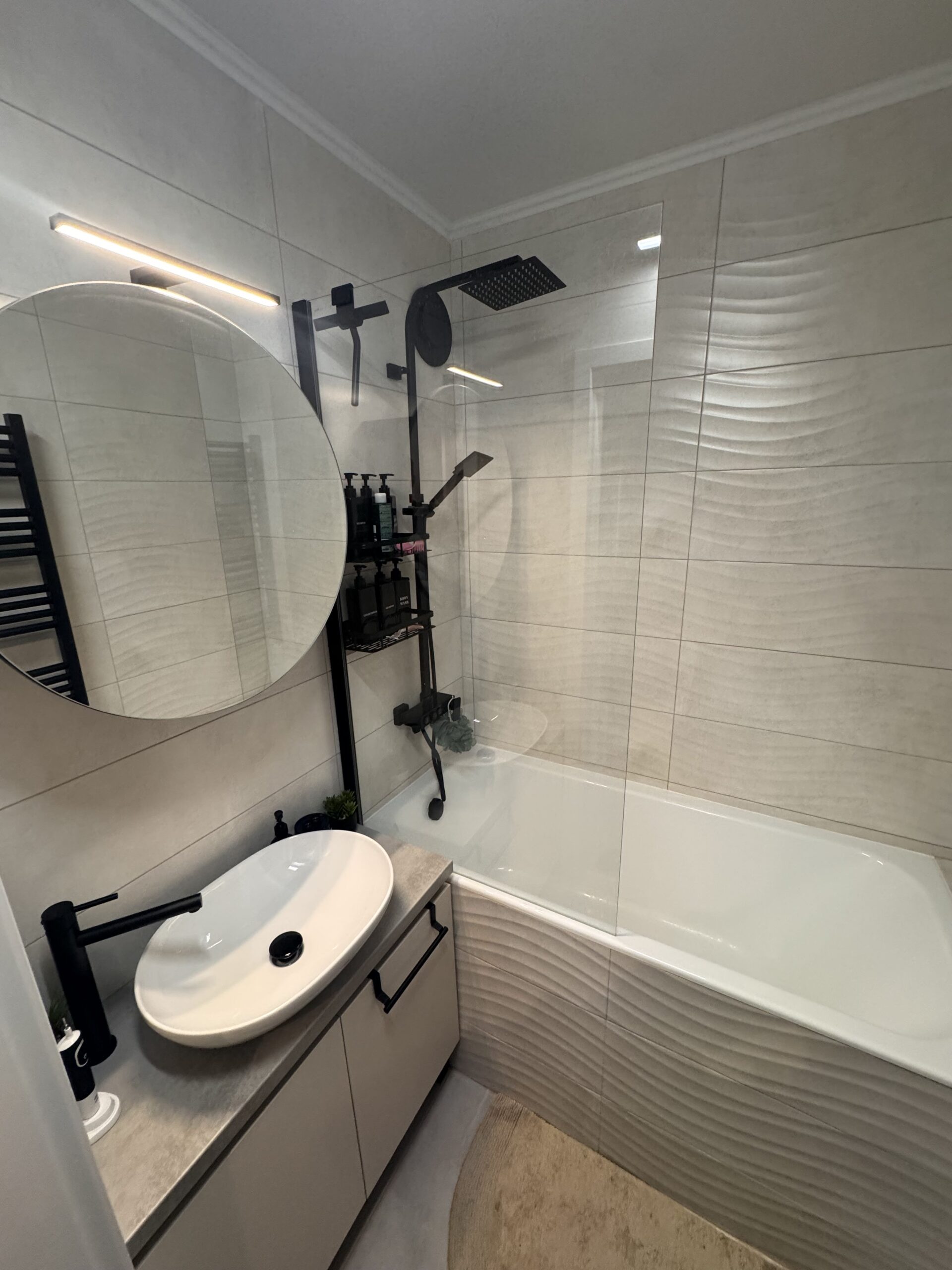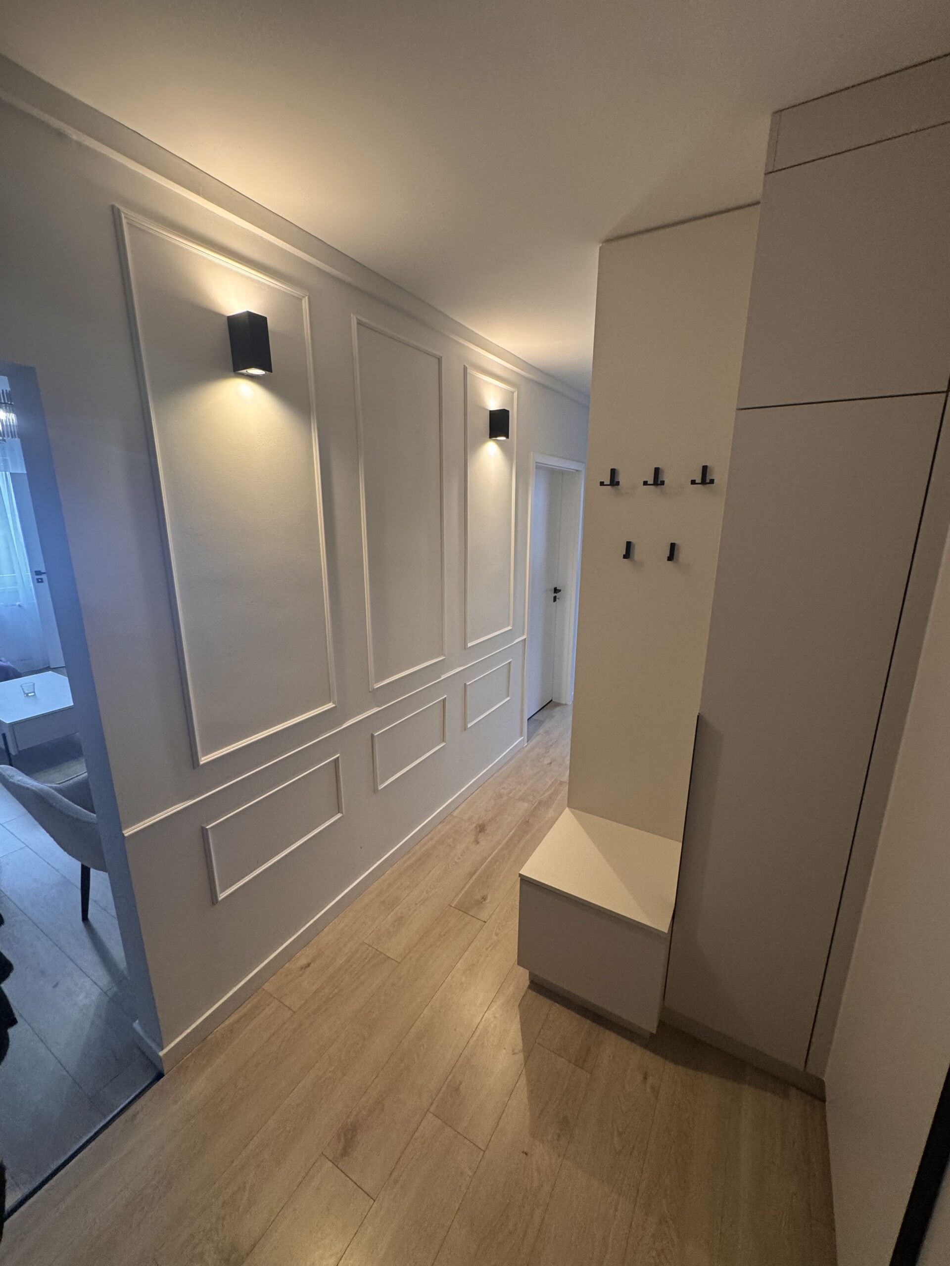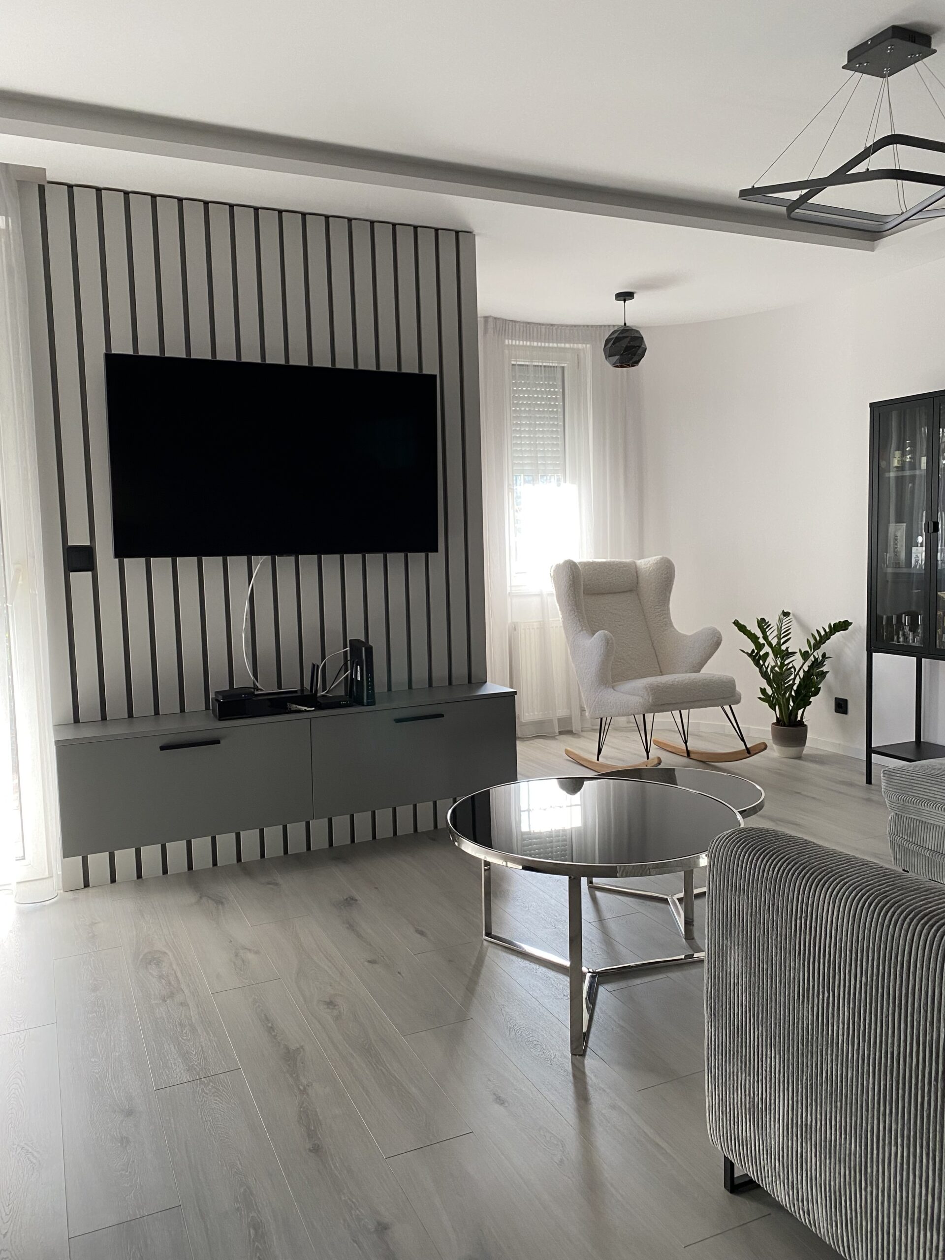 A végeredmény egy világos, letisztult és harmonikus lakás lett, ahol a fa hatású padló, a fehér felületek, a fekete kiegészítők és a modern világítás egységes, prémium hatású enteriőrt alkotnak.